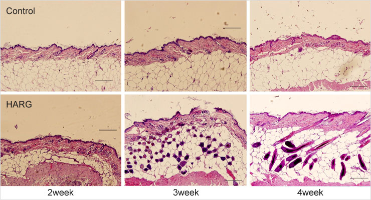 毛部分にハーグ療法を施した基礎実験データです。未治療群(control)は、毛包の出現が認められません。HARG治療群(HARG)では、3週間後に毛包が出現し、4週間目で毛包の成熟が認められています。 ハーグ量の効果は、多くの基礎実験により証明されています。
