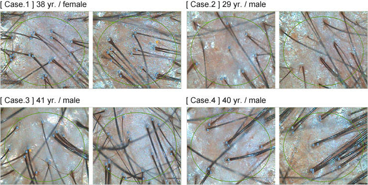 実際にハーグ療法を行った症例の頭皮の状況を示しています。ハーグ療法により、一つの毛穴から出る毛髪の本数が増えて、毛髪が太くなっていることが分かります。 ハーグ療法の効果が実際の症例においても証明されています。